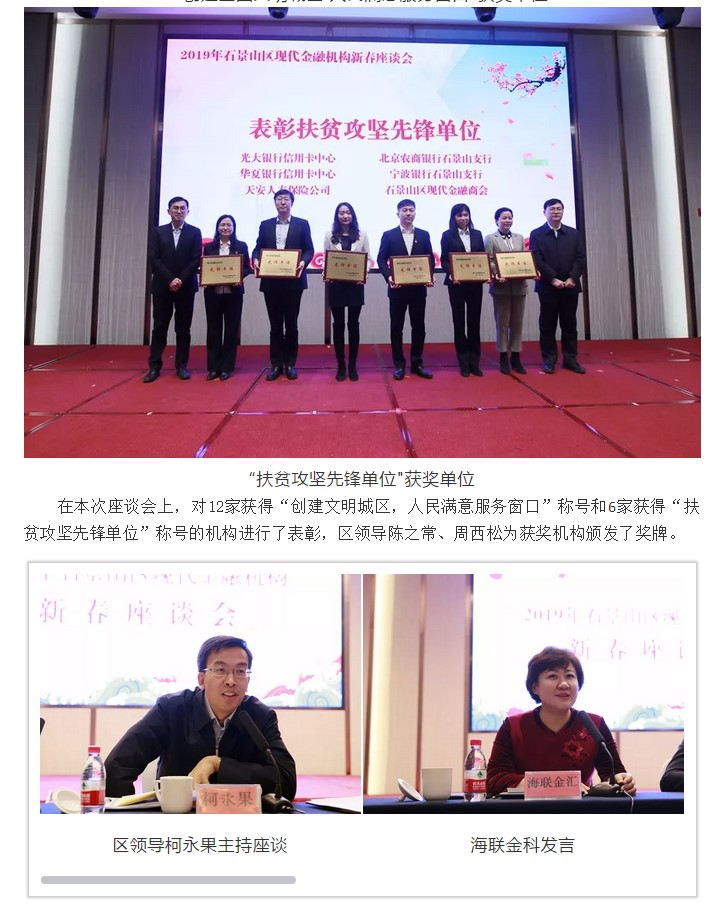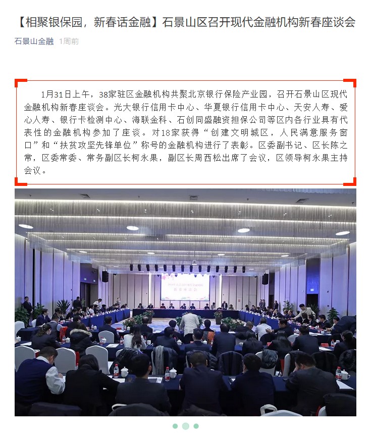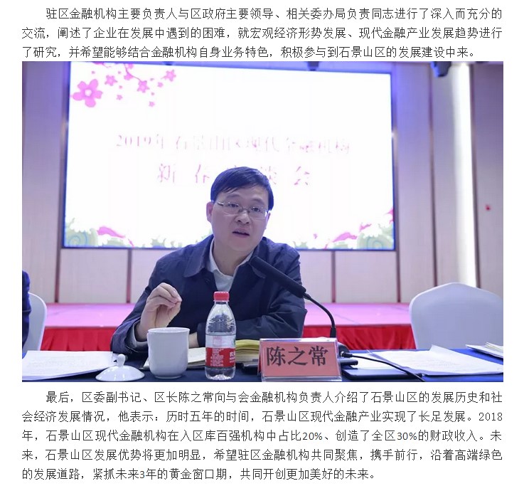 1月31日,石景山区现代金融机构新春座谈会在北京银行保险产业园召开,区委副书记、区长陈之常,区委常委、常务副区长柯永果,副区长周西松出席了会议。石景山区各行业具有代表性的金融机构参加了座谈,北铁中心作为大宗商品现货交易机构代表参加了本次座谈会,游松总裁参会并发言。