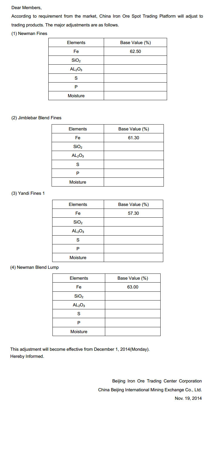 Announcement of the Trading Service Fee Standard of China Iron Ore Spot Trading Platform