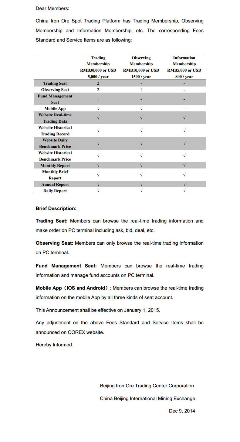 Announcement of the Annual Fees Standard and Service Items for Membership Types on China Iron Ore Spot Trading Platform