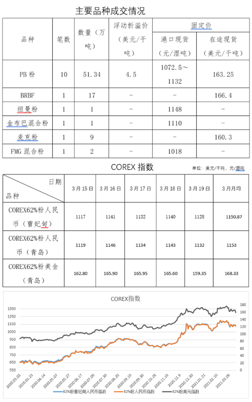3月15日-3月19日成交22笔共92.09万吨,其中在途4笔66.5万吨,港口18笔25.59万吨。