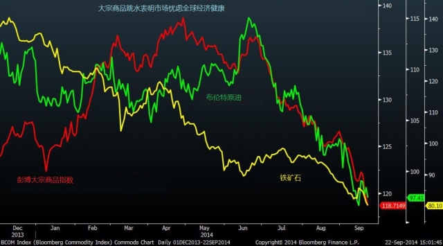 今年以来覆盖22种基础商品的彭博大宗商品指数下跌5.6%,刷新五年新低;布伦特原油下跌12%,在上周创下两年新低;交付青岛港的铁矿石价格今年以来下跌41%,跌至2009年以来最低。