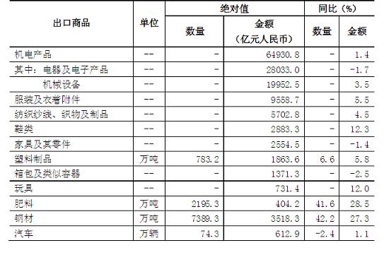 四、机电产品、传统劳动密集型产品出口增长。前10个月,我国机电产品出口6.49万亿元,增长1.4%,占出口总值的55.5%。其中,电器及电子产品出口2.8万亿元,下降1.7%;机械设备2万亿元,增长3.5%。同期,服装出口9558.7亿元,增长5.5%;纺织品5702.8亿元,增长4.5%;鞋类2883.3亿元,增长12.3%;家具2554.5亿元,下降1.4%;塑料制品1863.6亿元,增长5.8%;箱包1371.3亿元,下降2.5%;玩具731.4亿元,增长12%;上述7大类劳动密集型产品合计出口2.47万亿元,增长5%,占出口总值的21.1%。此外,肥料出口2195.3万吨,增加41.6%;钢材7389.3万吨,增加42.2%;汽车74.3万辆,减少2.4%(表1)。