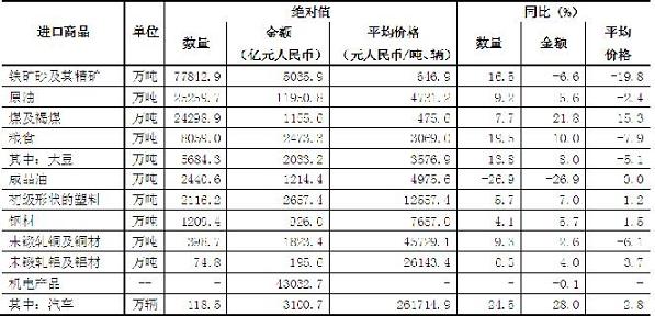 此外,进口煤2.43亿吨,减少7.7%,进口均价为每吨475.6元,下跌15.3%;成品油2440.6万吨,减少26.9%,进口均价为每吨4975.6元,与去年同期基本持平;未锻轧铝及铝材74.8万吨,减少0.3%,进口均价为每吨2.61万元,下跌3.7%。机电产品进口4.3万亿元,下降0.1%;其中汽车118.5万辆,增加24.5%(表2)。